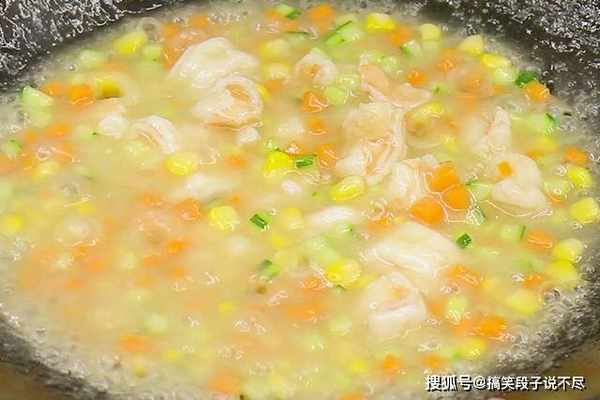 起锅内烧水,放入黄瓜丁、胡萝卜、玉米粒汆煮1分钟左右,然后放入虾仁,继续煮至虾仁打卷变色后捞出控水。