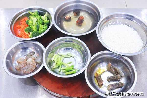 准备几只鲜虾,把虾仁剥出来,用牙签挑出虾线,虾头留下来、一会儿煸虾油;小葱头几根、切成段;胡萝卜半根、切成丁;西兰花把根茎去除,切成小块,用淡盐水浸泡洗干净;几粒干香菇,用清水泡发切成小块,增加天然的鲜香味。