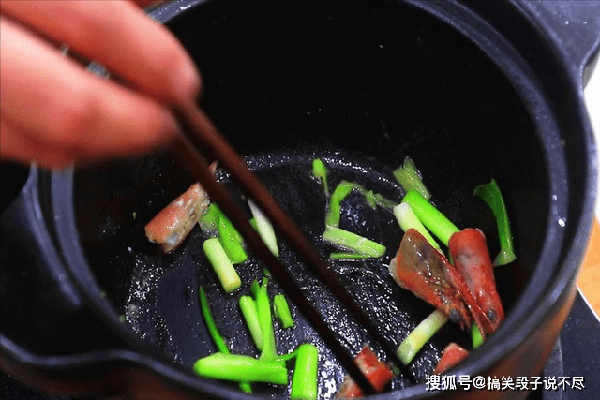 砂锅烧热,加入少许底油,放入虾头和葱段,开小火煎一会,煎出虾油、把葱段爆香。