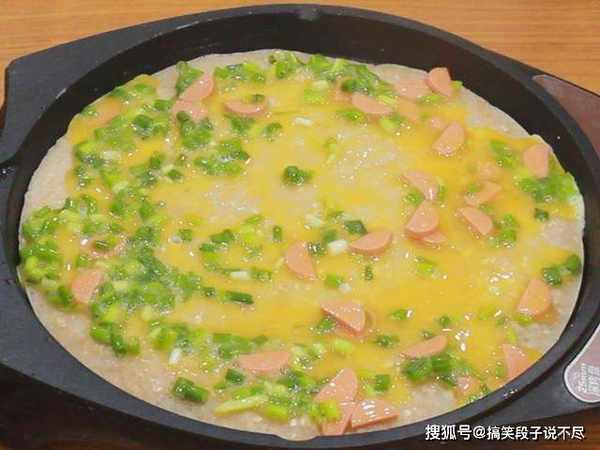 2分钟以后,面糊已经基本定型,把调好的蛋液均匀地淋在上面,盖上锅盖再烙1分钟,烙至蛋液全部定型后翻过来,把剩余的蛋液倒在上面,继续烙1分钟,时间到再次翻面。
