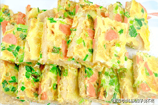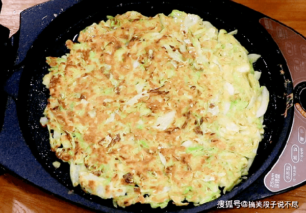 保持小火大约烙制5分钟,烙制蛋液全部定型,表面呈金黄色时即可出锅,把烙好的饼切成均匀的小块,美味即成。