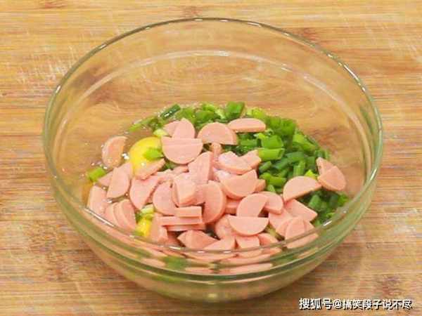 碗中打入三个鸡蛋,切点葱花、火腿片放入碗中,加入食盐2克,搅拌均匀备用。