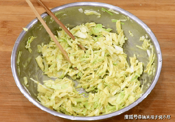 准备包菜半颗,清洗干净后切成细丝放入盆中,加入食盐2克,鸡粉2克,十三香1克,蚝油5克增鲜,打入三个鸡蛋搅拌均匀,加入面粉50克,搅成粘稠状即可。