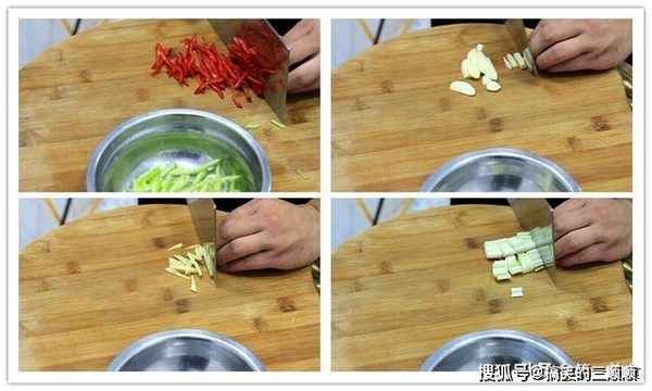 青红椒各一片切成丝,大蒜全部切成蒜片,生姜切成姜丝,大葱破开切成葱粒。