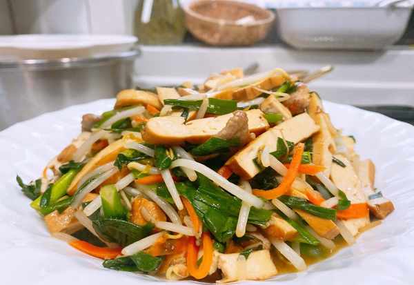 步骤3:加豆芽、韭菜和胡萝卜丝,加盐和蚝油调味,翻炒至断生,就可以出锅了。