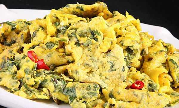 步骤3:起锅烧油,倒入荠菜鸡蛋液加热凝固,然后翻炒均匀就可以出锅了。