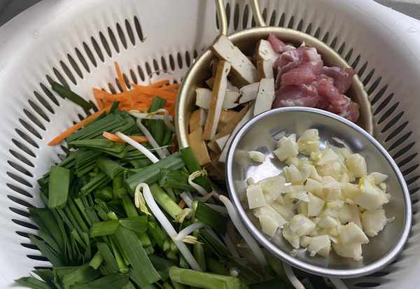 步骤1:韭菜洗干净切段,豆芽洗干净沥干水分,胡萝卜切丝、猪肉切丝、香干切条备用。