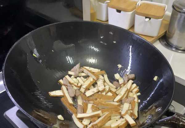 步骤2:起锅烧油,放入猪肉翻炒变色,再加蒜末煸香,然后放入香干一起翻炒片刻。