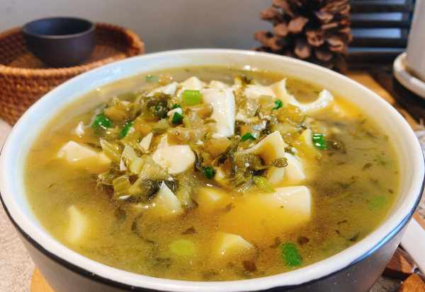 食材:雪菜、雷笋、豆腐、盐、鸡精、葱花、蒜、食用油。