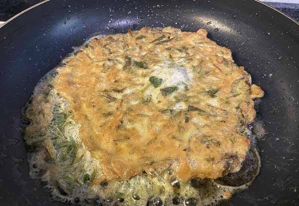 步骤3:起锅烧油,倒入香椿鸡蛋液加热凝固,翻面后,煎熟就可以出锅了。