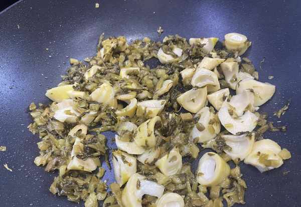 步骤2:起锅烧油,加蒜片煸香,倒入素雪菜和春笋炒一炒,然后倒入热水,大火烧开。