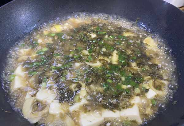 步骤3:放入豆腐,再加盐和鸡精调味,撒些葱花,就可以出锅了。