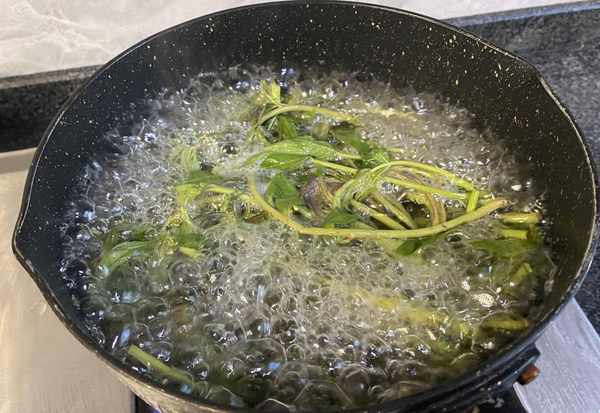 步骤1:香椿清洗干净,然后锅中烧开水,放入香椿焯水煮熟。当香椿变绿之后,再把香椿捞出,沥干水分备用。