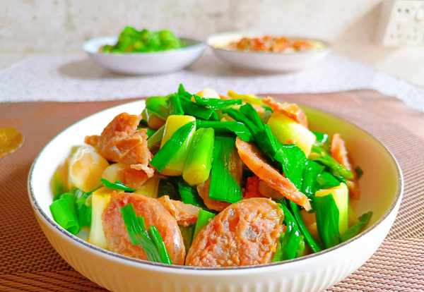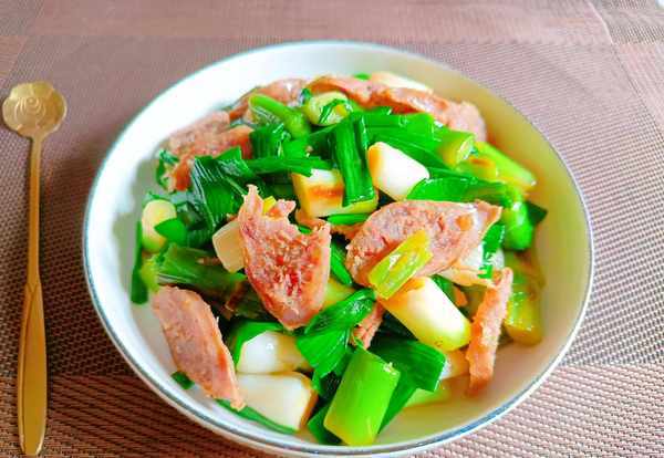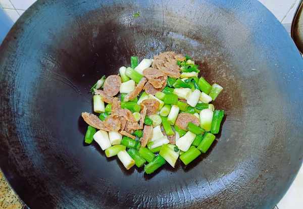 食材:蒜苗350克、腊肠100克、盐、食用油、料酒、葱、姜