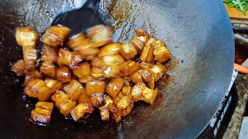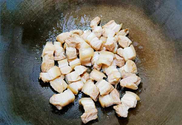 ③锅中滑油,倒入五花肉炒。小火炒干表面水分,加点料酒去腥,继续翻炒一会儿。