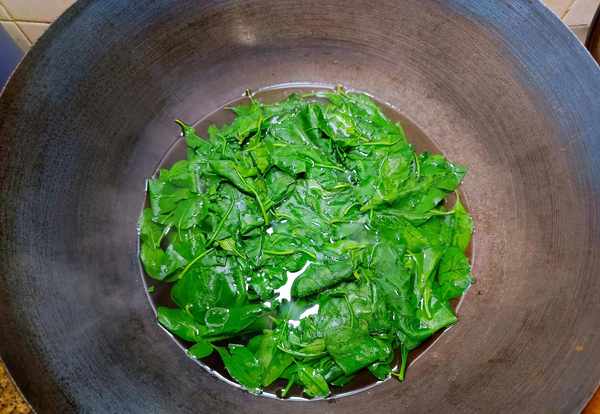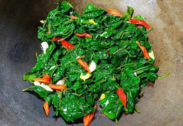 ④放入蒜子、辣椒炒香,倒入枸杞叶快速翻炒。