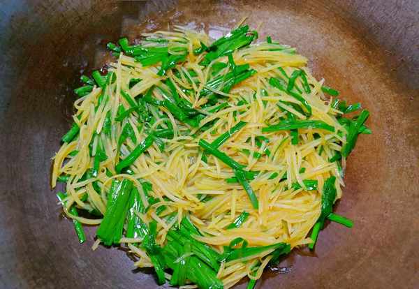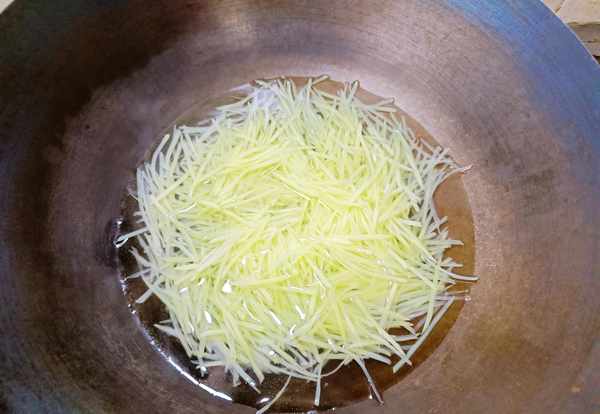 ②锅中滑油,倒入沥干水分的土豆丝。开大火爆炒,一直炒到土豆丝变透明。