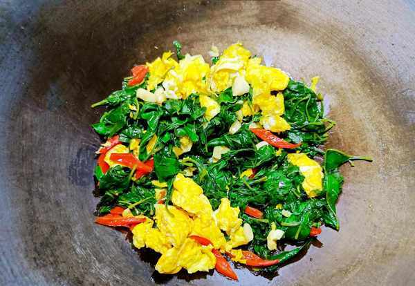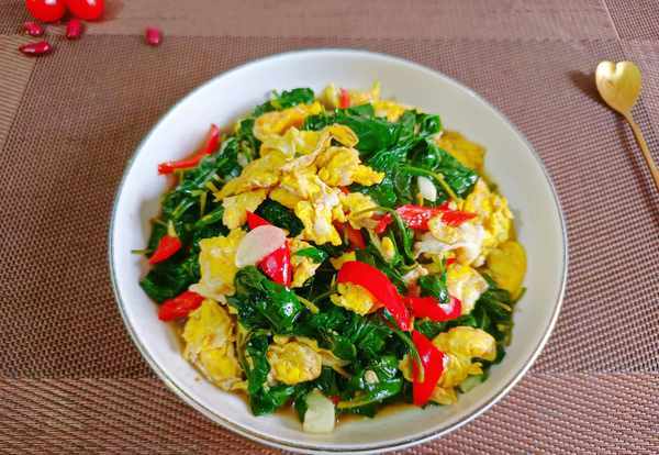 食材:枸杞叶150克、土鸡蛋3个、蒜子、辣椒、盐、食用油