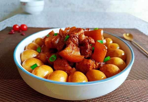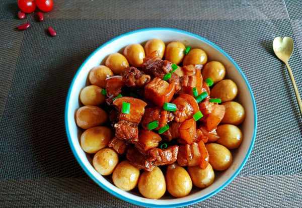 ⑤等到五花肉可以用筷子插进去时倒入鹌鹑蛋,再加盐调味,继续焖煮10分钟。