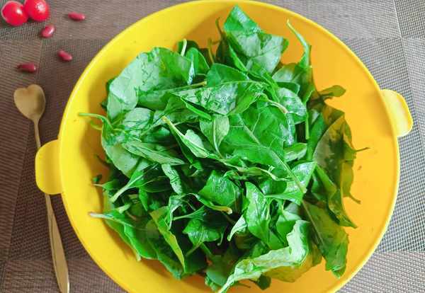 ①我们把枸杞叶摘下来,泡入淡盐水中10分钟。搓洗干净,捞出来。