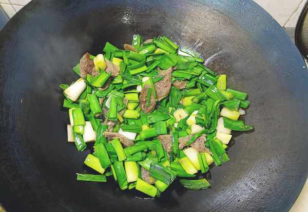 ③韭菜洗干净,切成小段,倒入锅中,开大火爆炒。