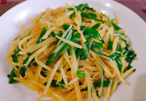 食材:土豆1个、韭菜少许、生抽、盐、食用油