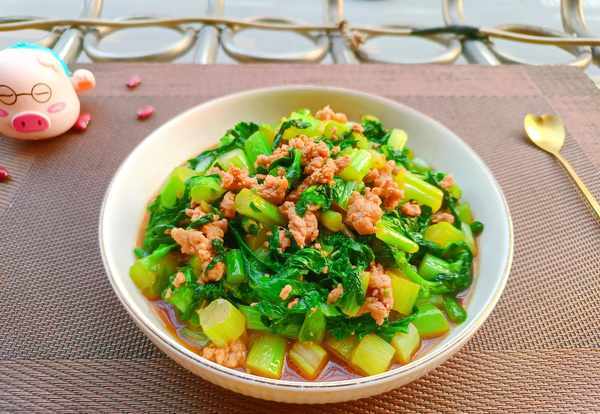③菜苔颜色加深,倒入肉末,开大火炒。