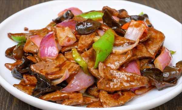 配方:猪肝、青红椒、洋葱、姜蒜、盐、白糖、鸡精、料酒、生抽、老抽、蚝油