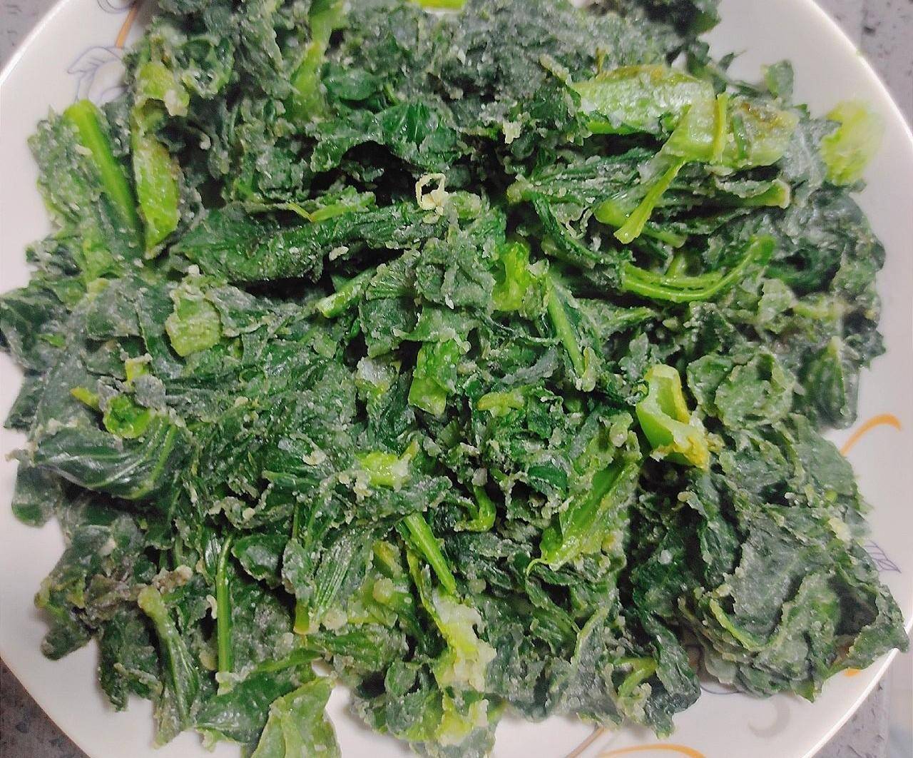 2、将地瓜叶切碎,少量多次向里面加入面粉,用手抄拌,直到面粉均匀地裹在叶子上。