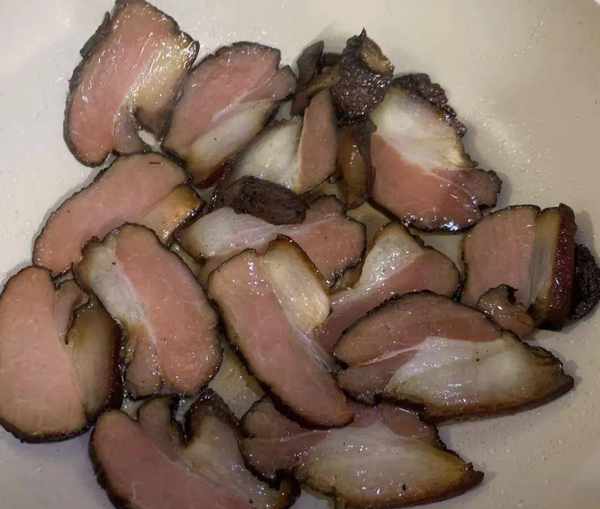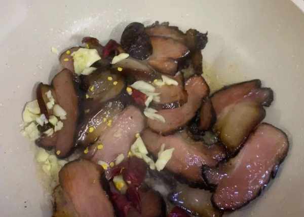 第三步,锅里放一点油,油热下腊肉去炒一会,然后放入蒜末干辣椒继续翻炒。