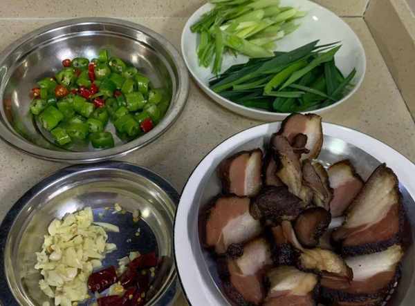 食材:蒜苗,腊肉,杭椒,干辣椒,大蒜