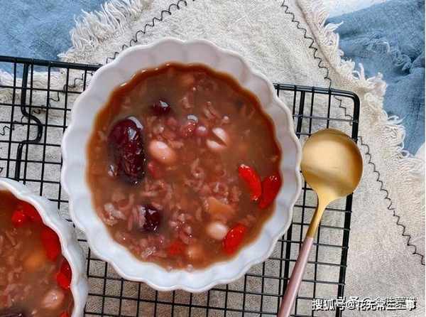 枸杞营养,足够滋补,因此想要喝枸杞相关的粥时,我们可以煲些枸杞红豆粥。准备100g红豆、2勺枸杞、100g大米,先将红豆在2L清水中泡10小时,然后将红豆与泡的水一起煮沸,再用小火煲半小时。
