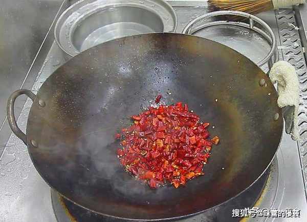 锅内烧油,油热后,加入红油,家庭做菜,可以适当的减少食用油的用量,把油烧至6成热,倒入焯过水的花椒,红干椒。