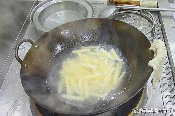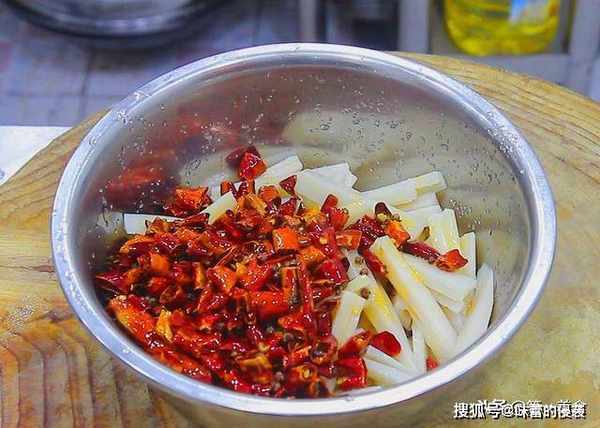 捞出后,用清水冲洗,控干水分后,倒在盆中,加入