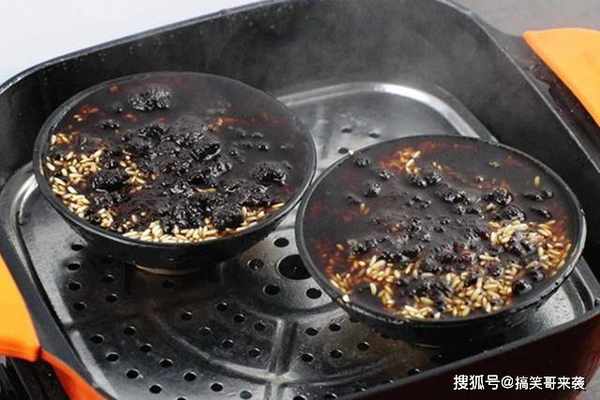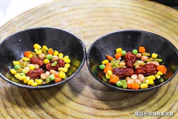 准备两个蒸碗,在碗底摆上红枣、花生、葡萄干、玉米青豆。