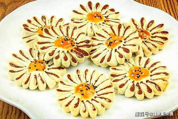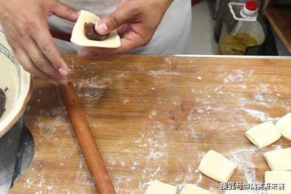 准备豆沙馅20克,加入少许面粉掺匀,揪下来一小块豆沙,用擀好的面块包住,收紧开口、多余的面揪掉不要,然后用刀背压成圆面片,剪成菊花的形状。