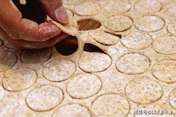 10分钟以后把面团取出来揉光滑,擀成半厘米厚的面片,然后用瓶盖压成一个一个的小饼。