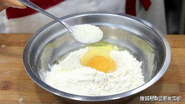 首先,我们准备低筋面粉100克,打入一个鸡蛋,加入白糖5克。
