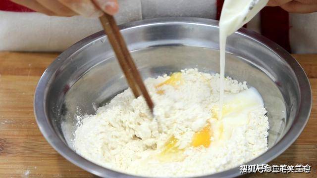 倒入180克的袋装纯牛奶一包,边倒边搅拌 ,把面粉搅成糊状,要搅到没有小疙瘩,用筷子能扯起丝就可以了。