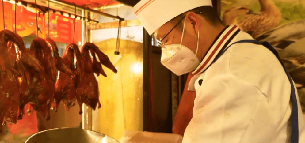 和刘国华一样在这一片做了20多年生意,从田园里市场搬迁到东华农贸市场的还有官氏宜良烤鸭。老板官艳林开烤鸭店已有26年,1999年,他从江岸小区搬到了田园里市场,其后也是在2014年搬迁到了现在的市场。官艳林带着26岁的儿子,每天早上不到6点就在店里忙活了,处理新鲜鸭胚,给鸭胚吹气上烤炉,同时还要做一锅卤鸭子、卤鸭翅、卤鸭胗等卤品。他自豪地说:“这锅卤水已经有26年的时间了。”从早忙到晚虽然很辛苦,官艳林却觉得很有盼头,他说市场改造以后,生意比以前更好了,挣得也更多了。早上7点,便开始有老顾客上门了,到上午9点半,他的鸭子已经卖了50只,35元一只的鸭子他一天要卖近300只。