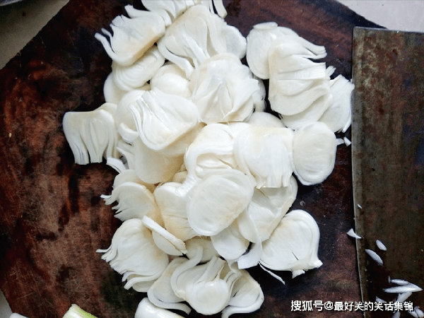 2、把外皮剥干净,这么嫩滑的蒜头,干净卫生,也就没必要清洗了,直接把蒜头放在案板上,用锋利的菜刀,改成切成薄片,