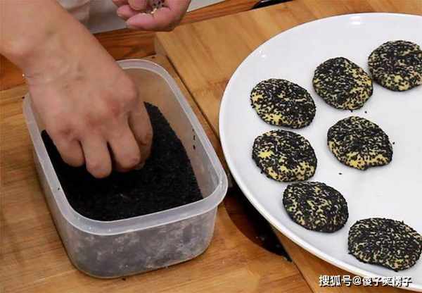 4.取适量的面团,在手心处团成圆球,放入装有黑芝麻的盒中,让其均匀裹上黑芝麻,再把圆球压扁,红薯饼的生坯就做好了。