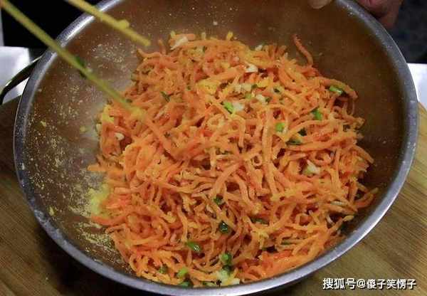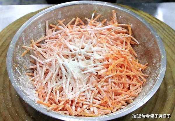 1.准备胡萝卜一根,削去外皮,先切成薄片再切成细丝放入盆中,淋入适量的植物油搅拌均匀,防止胡萝卜在蒸的过程中大量出水,放入玉米面50克搅拌均匀,加入小麦面粉50克,用手抓匀备用。