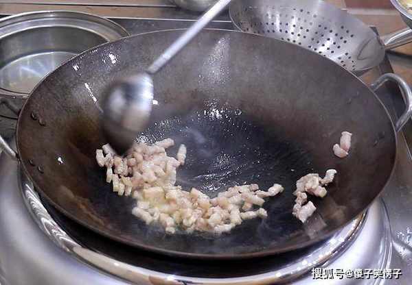 3.锅内烧油,充分滑锅以后倒出热油加入凉油,倒入葱片、姜丝,一粒八角一起翻炒,把香料炒干、炒香,葱姜炒成金黄色时捞出来不要,把五花肉倒入锅中煸炒出里面的肥油。