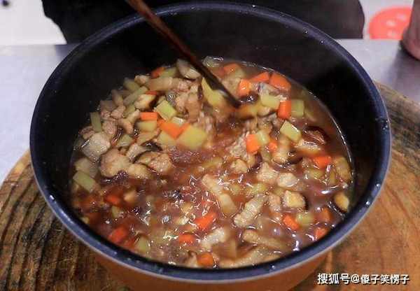 5.把配菜连同汤汁一起倒入电饭煲中,