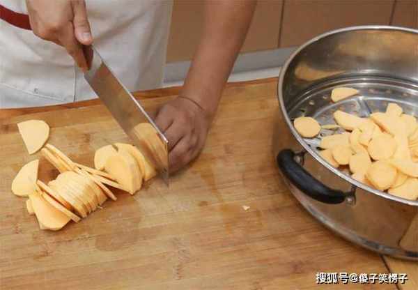 1.准备红薯一个,从中间破开切成均匀的薄片,把切好的红薯片放入蒸笼里面,水烧开以后上笼蒸制10分钟。