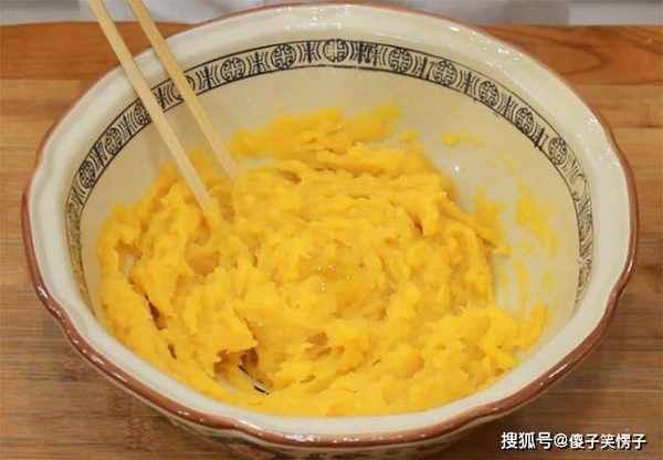 2.红薯蒸熟以后倒入盆中,根据自己的口味加入适量的白糖,趁热把白糖搅化,把红薯搅成细腻的红薯泥,加入蜂蜜10克,蜂蜜能使做出来的红薯饼更加香甜,搅拌均匀后静置放凉备用。