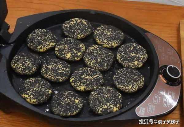 5.电饼铛预热3分钟,均匀刷上植物油,把做好的生坯放入锅中,盖上锅盖烙2分钟。2分钟以后在饼皮上面均匀淋上植物油,锁住饼内的水分防止烙糊,把饼翻过来以后再烙3分钟,两面都呈金黄色即可出锅。