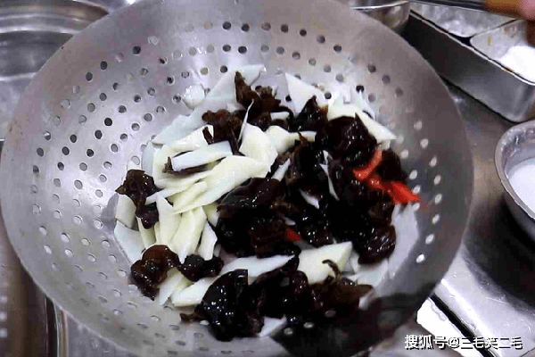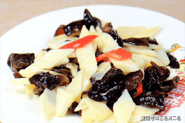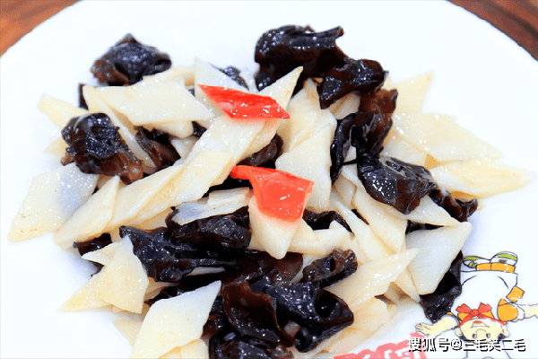 再准备半个红椒,切成菱形片用来配色,木耳泡软以后捞出来,用手撕成小块备用。