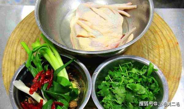 准备新鲜的嫩鸡半只,在鸡身上剁上几刀,方便入味。斩掉鸡脚趾,用清水多洗几次。盆中放入白芷几片、八角5粒、草果两个、一小把小茴香、生姜一块,切成片。大葱两根挽成结,全部放在一起。准备葱叶一把,切成葱花香菜一把,切成段备用